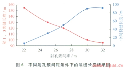 根據改造儲層的物性參數以及相鄰水平井的壓裂施工參數,對要優化的水平井進行了“分段多簇”壓裂裂縫擴展模擬,不同射孔簇間距條件下得到的壓裂裂縫長度如圖6所示(考慮對稱性,兩端射孔簇的裂縫在圖中只畫一條曲線):當射孔間距為22.0m時,中間射孔簇的壓裂裂縫基本沒有壓開,只形成了很短的壓裂裂縫。當射孔簇間距為30.0m時,中間的射孔簇形成的壓裂裂縫和兩端射孔簇形成的壓裂裂縫基本相當。因此,壓裂設計過程中,射孔簇的間距設定在30.0m左右比較合適,根據射孔簇間距參數,每個壓裂段的長度確定為90.0m,壓裂段數為ll段。