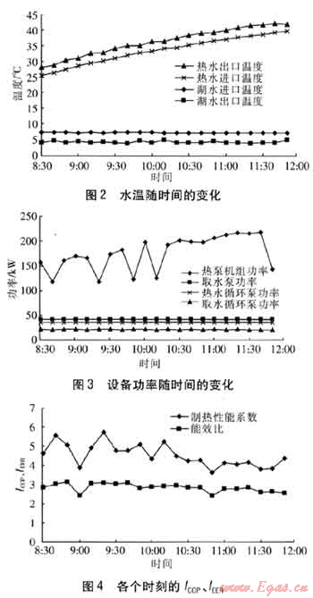 測試時間為2011年1月12日至14日,每天8:30—11:50,測試時間間隔為10min,確定系統運行基本穩定后進行測試。測試數據包括:熱泵機組功率、熱水循環泵功率、取水泵功率、取水循環泵功率、熱泵機組熱水進出口溫度和流量、熱泵機組湖水進出口溫度和流量。取水系統原設計采用變頻控制,但測試時變頻器未最終調試完成,因此取水系統采用定流量運行。熱水循環系統也采用定流量運行。